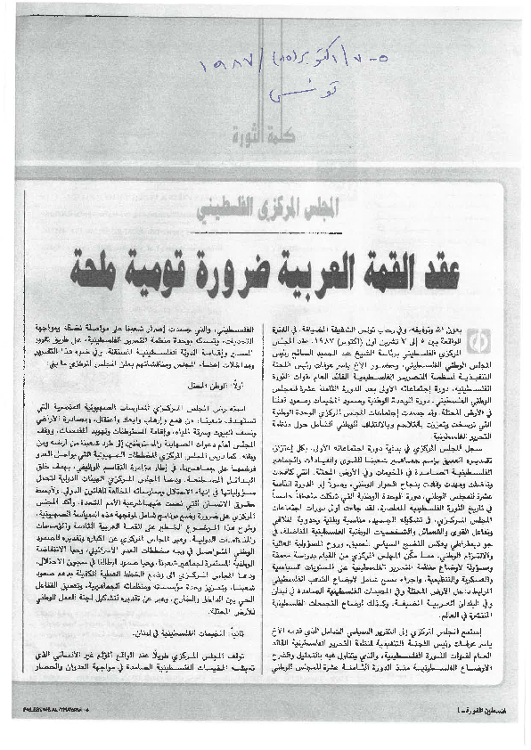 بعون الله وتوفيقه، في رحاب تونس الشقيقة المضيافة، في الفترة الواقعة بين 5 و 7 تشرين الأول/ أكتوبر 1987 عقد المجلس المركزي الفلسطيني برئاسة الشيخ عبد الحميد السائح رئيس المجلس الوطني الفلسطيني، وحضور الأخ ياسر عرفات رئيس اللجنة التنفيذية لمنظمة التحرير الفلسطينية القائد العام لقوات الثورة الفلسطينية دورة اجتماعاته الأولى بعد الدورة الثامنة عشرة للمجلس الوطني الفلسطيني، دورة الوحدة الوطنية وصمود المخيمات وصمود أهلنا في الأرض المحتلة، وقد جسدت اجتماعات المجلس المركزي الوحدة الوطنية التي ترسخت وتعززت بالتلاحم وبالالتفاف الوطني الشامل حول منظمة التحرير الفلسطينية.
